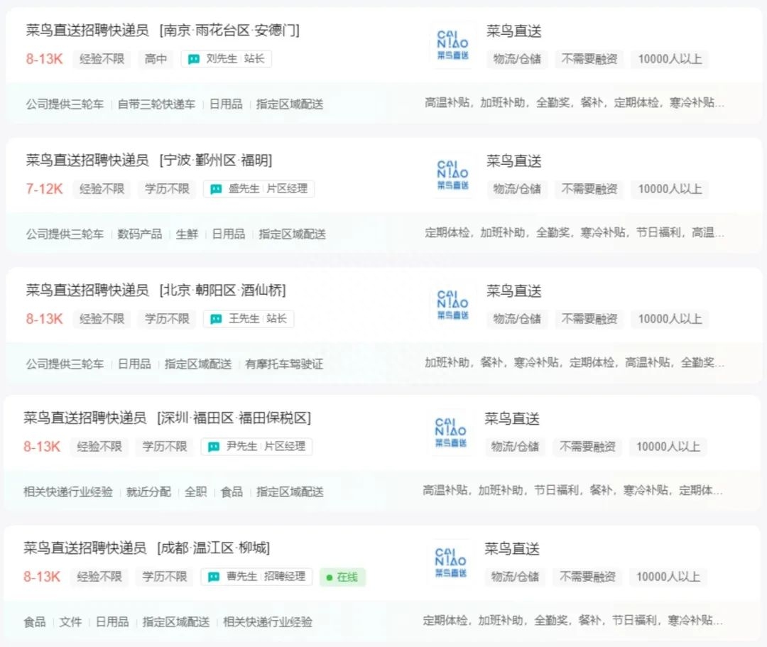 我们注意到,近期在各大招聘平台和社交平台上,菜鸟速递的招聘需求出现了明显提升。