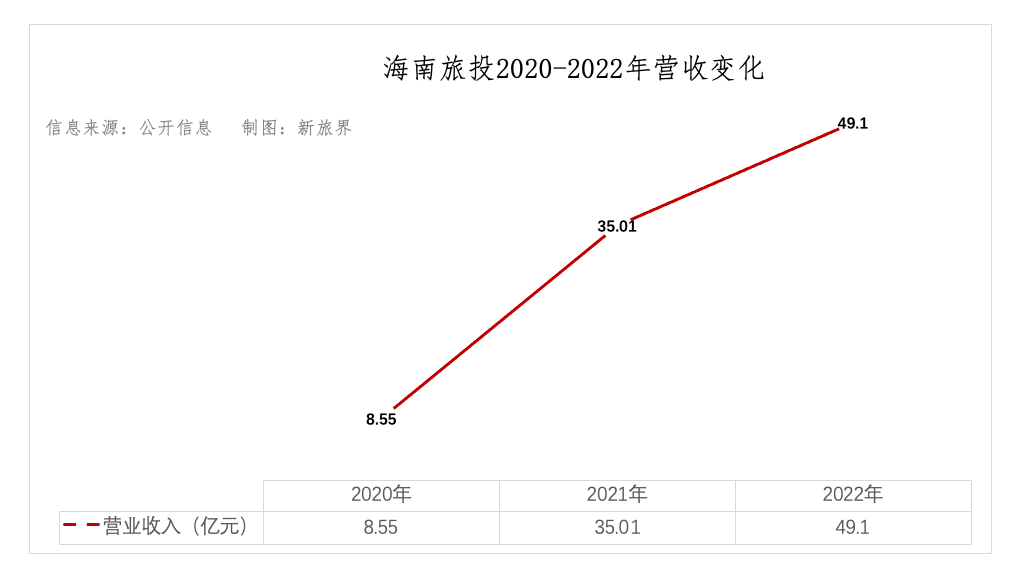 数据显示,2020年-2022年,海南旅投营业收入持续增长,分别为:8.55亿元、35.01亿元、49.1亿元。