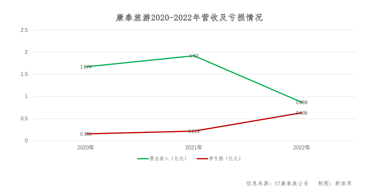 2017年8月14日,康泰旅游在新三板挂牌申请获得批准,成为全国首家成功挂牌新三板的目的地地接服务旅行企业。不过,受疫情影响,康泰旅游近几年连续陷入亏损境地。财报数据显示,2020年至2022年,康泰旅游营收分别为1.674亿元、1.92亿元、0.869亿元,净亏损分别为0.155亿元、0.219亿元、0.636亿元。