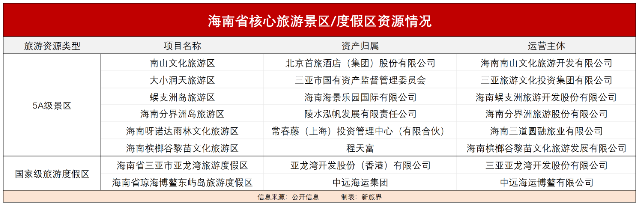 新旅界梳理发现,目前,海南全省有南山文化旅游区、大小洞天旅游区等6个5A级旅游景区,分别被首旅、三亚市国资委等持有;拥有三亚市亚龙湾旅游度假区、琼海博鳌东屿岛旅游度假区2个国家级旅游度假区,分别为亚龙湾公司、中远海运集团所有。