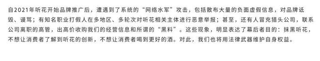听花酒还在声明中透露,自2021年听花开始品牌推广后,遭遇到了系统的“网络水军”攻击,这些现象明显表达了幕后者的目的——抹黑听花,不想让消费者了解到听花的创新。对此,公司也将用法律武器维护自身权益。