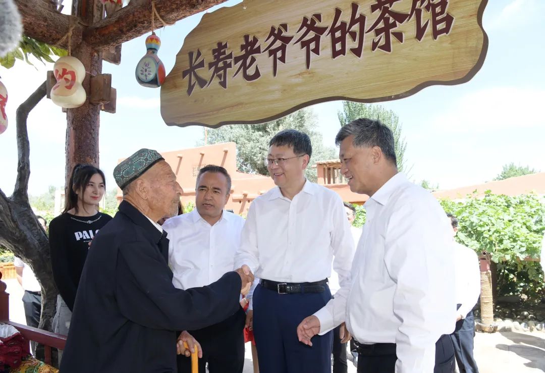巩固拓展脱贫攻坚成果、推进乡村振兴是新疆发展的重要抓手,也是上海对口援疆工作的切入点。27日下午,上海市代表团一下飞机,便马不停蹄驱车前往泽普县长寿民俗文化村,这个村庄是上海文旅帮扶、发展乡村旅游的一个典范。依托金湖杨景区的旖旎风光和当地特色民俗风情,来这里赏景体验的游客络绎不绝。陈吉宁、马兴瑞听取上海文旅援疆助力乡村旅游发展、带动群众就近就业、促进乡村示范点建设等情况介绍,沿途察看当地特色手工艺品和茶馆农家乐。93岁的村民木哈买提·买买提是自家茶馆的“活招牌”,沪疆两地领导向老人亲切问好,关切询问日常生活和经营收入。老人动情地说,“感谢党的好政策,感谢上海亲人,一大家子现在的生活越来越好,日子比冰糖还甜。”陈吉宁祝老人健康长寿、家庭幸福,生活越过越红火。