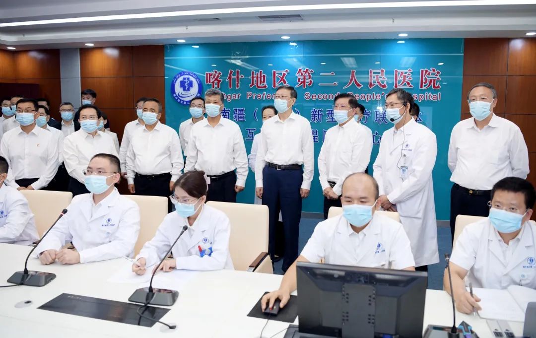 得益于上海首创的医疗人才“组团式”支援,喀什地区第二人民医院成功“创三甲”,并向“强三甲”迈进。陈吉宁、马兴瑞来到医院,了解医院总体建设、医疗水平提升及服务病患相关情况。设在医院的南疆(喀什)新型医联体互联网远程医学中心,几名医生正和莎车县医院医生、上海仁济医院专家进行视频连线,对患者进行远程会诊。在医学影像中心,负责人告诉沪疆两地领导,依托先进技术设备和医疗人才培养,优质医疗资源从上海引入喀什,下沉到县、服务到乡、辐射到村。陈吉宁说,要不断深化拓展医疗人才“组团式”支援模式,推动援疆医疗人才更好发挥专业优势,打造一支带不走的高水平医疗队,造福更多当地群众。