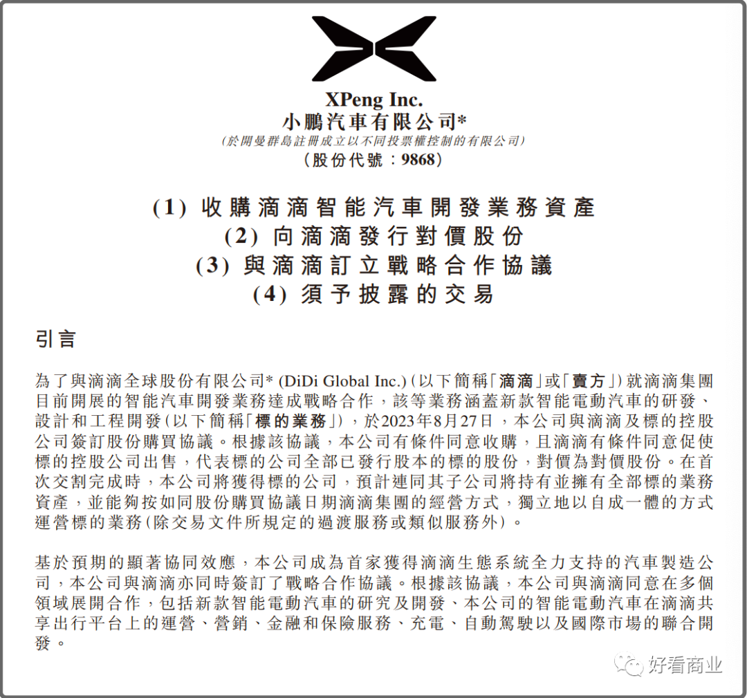 在资本层面,小鹏将收购滴滴的智能汽车开发业务,包括新款智能电动汽车的研发、设计和工程开发。