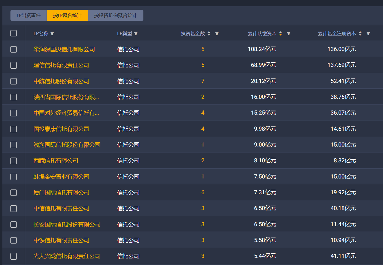执中ZERONE数据平台统计,今年已有44家信托公司作为LP(为风险投资公司提供主要资金)出资了81支基金,出资金额超过320亿元。21家信托公司投资基金数量在2只以上,华润信托、建信信托、中航信托、陕国投信托以及外贸信托累计认缴资本均超10亿元,华润信托年内认缴出资额已达108.24亿元。