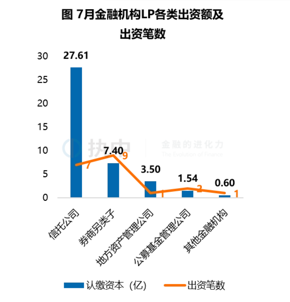 仅今年7月份,银行业机构、证券业机构、保险业机构、资产管理机构以及其他金融机构中共计22家LP对私募股权基金进行了出资,已披露的出资额合计40.64亿元。其中,TOP5金融机构LP出资分布中,信托公司出资金额接近七成,占比67.94%。
