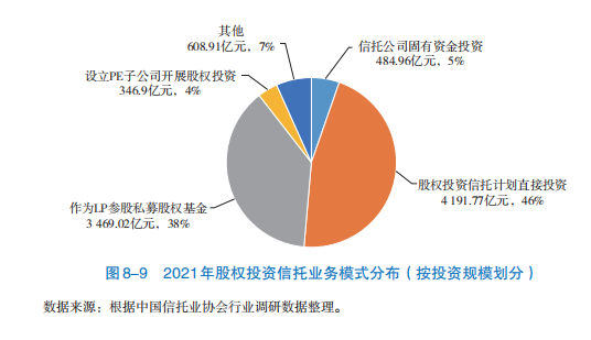 据中国信托业协会调研的2021年数据显示,过往信托公司参与股权投资通常采取四种业务模式:固有资金直接投资模式、股权投资信托计划直接投资模式、参股私募股权投资基金模式、通过信托PE子公司投资模式。其中,又以股权投资信托计划直接投资模式与参股私募股权投资基金两种模式为主。