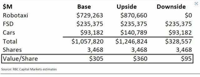 7月19日,加拿大皇家银行资本市场分析师Tom Narayan为特斯拉的业务进行估值,他在报告中认为,特斯拉汽车业务的估值约为931.82亿美元;FSD业务的估值约为2353.75亿美元;robotaxi业务的估值约为7292.63亿美元,要远远超过FSD和汽车业务。
