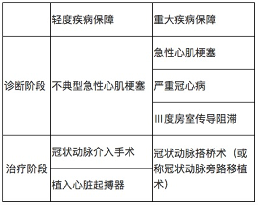 除了重疾之外,全保通还提供30种轻度疾病的保障,可以覆盖部分某些疾病重疾保障除外的责任。以常见冠心病为例,从诊断阶段到治疗阶段,根据风险程度和实际损失情况可以获得重大疾病保险金和轻度疾病保险金的赔付。详见下表。