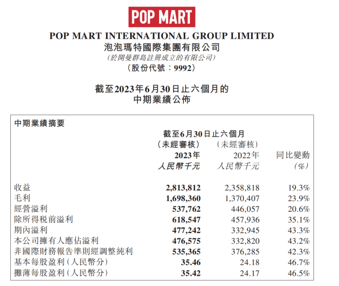 8月23日上午,泡泡玛特发布半年报,核心数据均给出亮眼表现。公司上半年营收达到28.14亿元,同比增长19.3%,效率也大幅提升,盈利增长高达43.3%,净利润为4.77亿元,超过去年全年的净利润。作为“潮玩第一股”,泡泡玛特的恢复充分体现了一家成熟企业的抗周期能力。