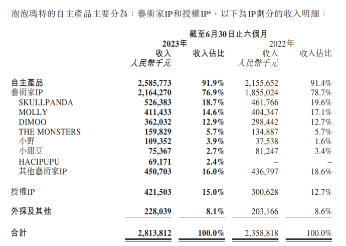 无论新老IP,在泡泡玛特的运作下,均获得了持久的生命力,也成为这家公司抵御周期变化的关键动力。2023年上半年,泡泡玛特艺术家IP收入增长16.7%,值得注意的是,“出道”三年的SKULLPANDA已经跃居首位,而“刚刚成年”——有18年历史的MOLLY在收入上仍有提升,而SKULLPANDA、MOLLY和DIMOO从2022年开始就已经稳居泡泡玛特自主IP收入贡献的前三名,收入分别同比增长14%、1.8%、21.3%。