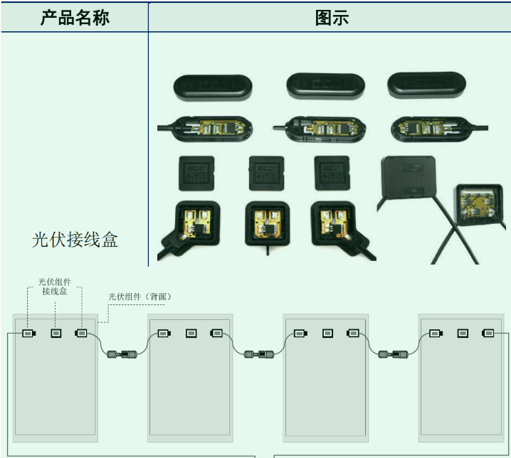 光伏接线盒由盒体、连接器和线缆组成,盒体中包含旁路保护电路及导电器件。