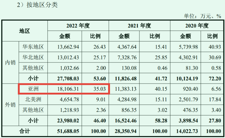 公司招股书显示:报告期内公司主营业务收入中境外收入占比分别为27.80%、58.28%和46.40%,境外销售区域主要以亚洲和北美为主,包括越南、马来西亚、泰国、韩国、美国等国家及地区。国内市场这么大,增长又很快,不知道泽润新能为什么反而没有把握住。