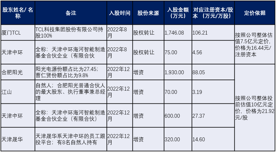 其中,厦门TCL在2022年8月通过受让股权的方式一次投资到位,目前持有公司106.21万股股份,占公司发行上市前股份总数的2.22%。而天津中环,则是分两次入股,天津晟华在2022年12月通过增资方式入股。