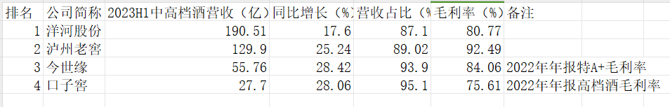 公司研究室注意到,上半年,这4家白酒的中高档酒营收占比均较高。其中,今世缘、口子窖的中高档酒营收占比均超过90%,泸州老窖的占比为89.02%,洋河股份的占比也达到了87.1%。