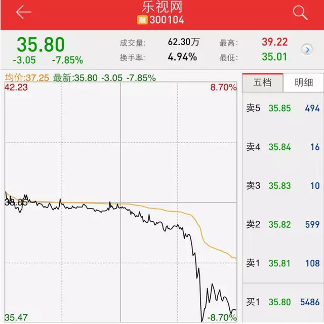 12月6日,乐视网(300104.SZ)报收35.8元每股,下跌7.85%,盘中最低价为35.01元每股,几乎触及跌停。