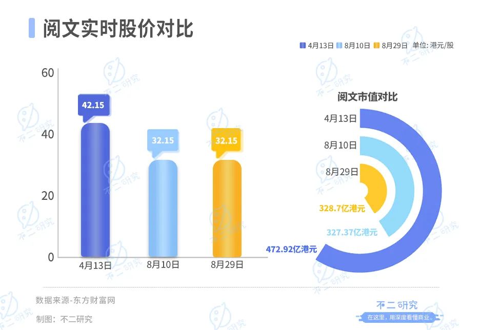 财报公布当天,其股价延期下行颓势,当日收盘下跌4.03%。截至8月29日收盘,阅文报收32.15港元/股,对应市值328.7亿港元(约折合人民币305.43亿元);对比4月的市值高点472.92亿港元,其市值已经蒸发43.87%。