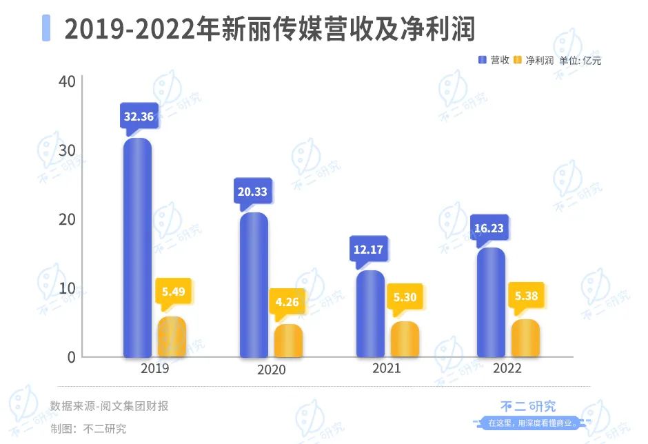 根据年报数据,2019年-2022年新丽传媒分别实现营收32.36亿元、20.33亿元、12.17亿元、16.23亿元,其中2021-2022年降幅达到33.36%;净利润分别为5.49亿元、4.26亿元、5.30亿元、5.38亿元,其中2021-2022年同比增长1.51%。