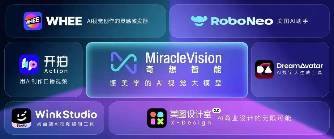 这其实有AI视觉创作工具WHEE;AI口播视频工具开拍;桌面端AI视频编辑工具WinkStudio;主打AI商业设计的美图设计室2.0;AI数字人生成工具DreamAvatar;美图AI助手RoboNeo;美图视觉大模型MiracleVision。