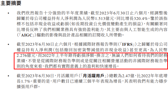最重要的是,美图的财报盈利了,而且赚得还增长了3倍。这也让美图财报中,写下了充满小孩子置气般的一句话:“2022年上半年录得净亏损,但2023年上半年,无论IFRS还是非IFRS看,都是实际意义上的盈利。”