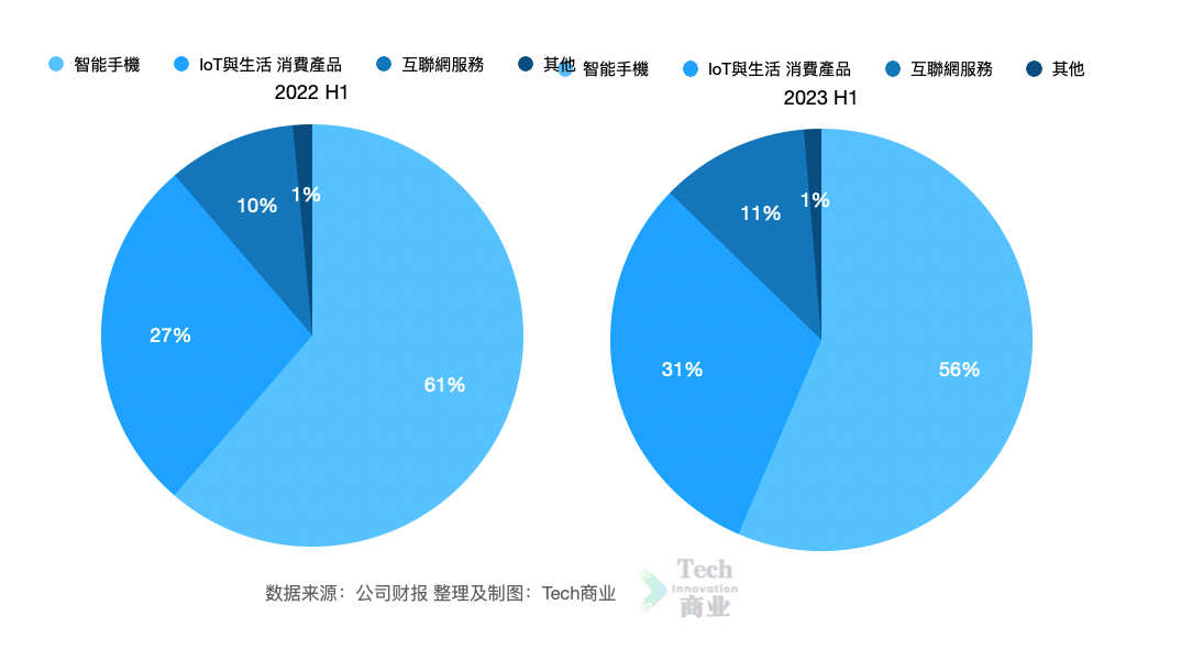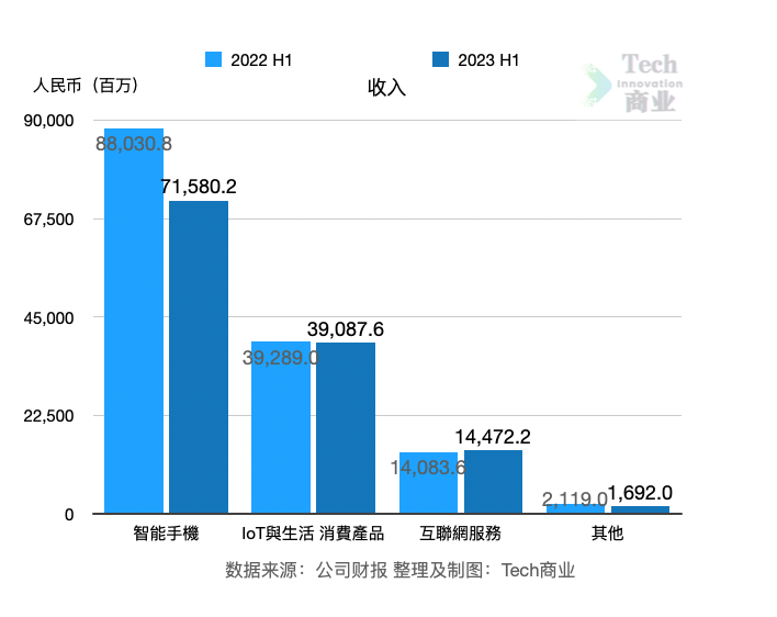 IoT与生活消费产品上半年收入为391亿元,同比上一财年同期的393亿元,该项收入微幅下降。