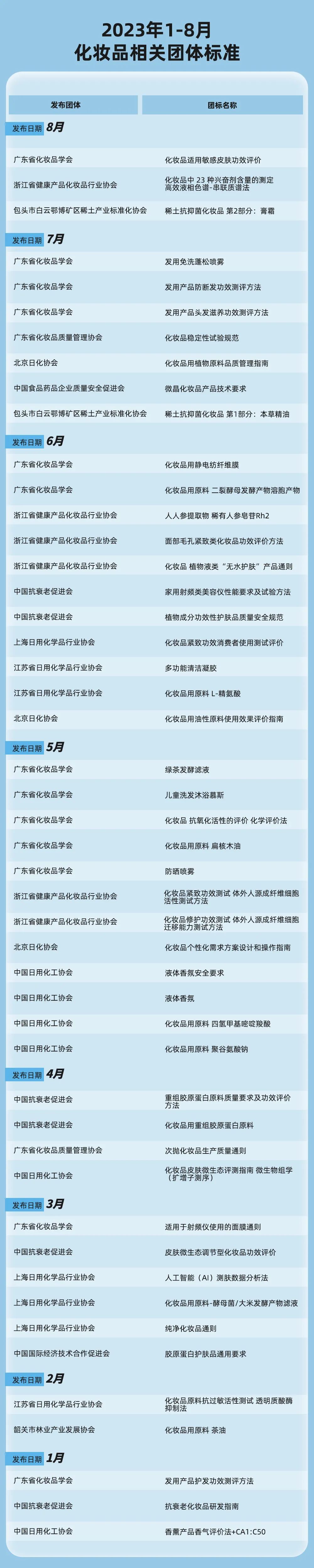 据《化妆品报》不完全统计,今年1-8月,国内超50部化妆品相关团体标准发布,这些团标多由美妆公司牵头、起草,行业协会归口、发布,涵盖AI测肤、纯净美妆、敏感肌、皮肤微生态、无水护肤等热门赛道,涉及二裂酵母、重组胶原蛋白、稀有人参皂苷等原料质量标准。