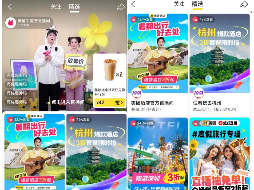 美团直播点进去之后,精选部分基本都是酒旅直播