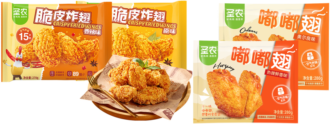 再者就是预制肉类小食的兴起。伴随空气炸锅的流行,不少品牌都在生产针对空气炸锅的美食,其中鸡米花、小酥肉、炸鸡翅等裹粉类产品既符合空气炸锅的烹制特点,从油炸到空气炸更能满足消费者“解馋但又怕胖”的饮食需求。这类产品的口味自不必说,以圣农为例,空气炸锅系列的脆皮炸鸡和嘟嘟翅两款产品,年销售额均破亿元,长年稳居电商平台鸡肉类目前列。