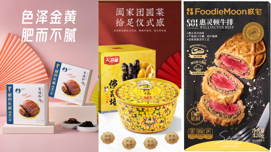 首先是从家常到高端。在最初的宅家吃饭、一人食等场景,水煮肉片、梅菜扣肉等肉类预制家常菜实现了不用外卖也能又快又好的吃到美味饭菜。伴随消费者的接受程度增加,佛跳墙、葱烧海参、西式的惠灵顿牛排等高端菜也出现在肉类预制菜中,在2022年初,预制菜年夜饭迅速走红,半小时搞定年夜饭的诱惑让它成为不少家庭过年餐桌的C位。