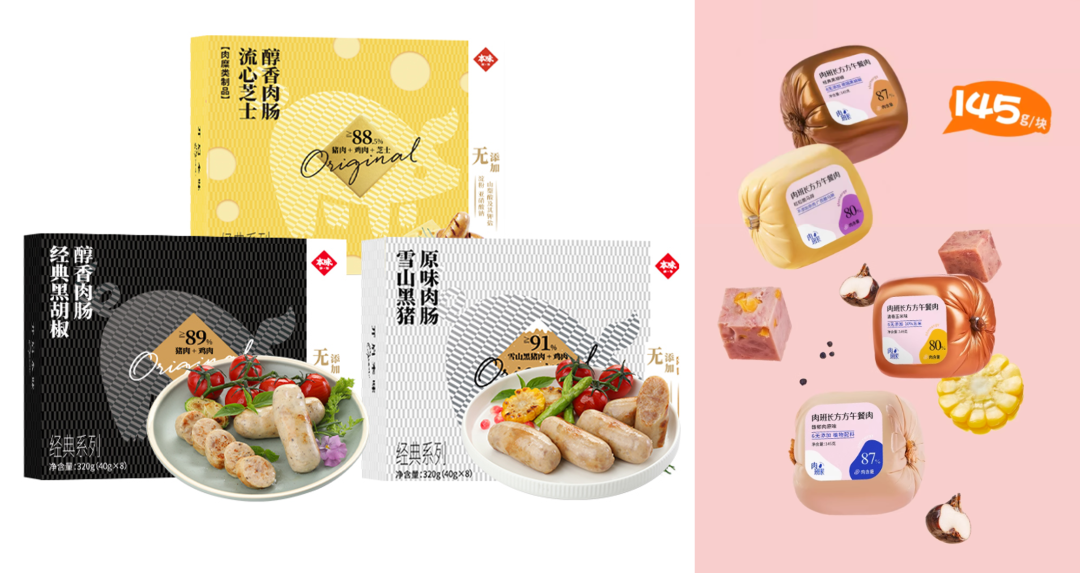 本味鲜物、肉班长、肉敢当等新兴肉制品品牌们则在产品力上发力,层层升级产品打造差异化。本味鲜物以“肉源做加法,配方做减法”的品牌差异点切入低温肉领域市占比最大的烤肠品类,肉源选择黑猪肉,在配方中减掉淀粉和不健康的添加剂,革新消费者对烤肠品类的认知,2021年销量突破1亿元,复购率达30%。低温午餐肉品牌肉班长打出了“不做淀粉肉”的品牌承诺,产品不添加亚硝酸盐、磷酸盐、香精、色素等添加剂,采用植物天然配料,扩大了适宜食用人群,从孕妇儿童到减脂健身,首款午餐肉产品上线2月后便有了近千万元的销售额。