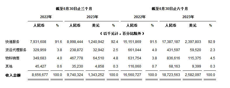 收入总额为人民币9,740.3 百万元(1,343.3百万美元),较2022年同期的人民币8,656.7百万元增长 12.5%。核心快递服务收入较2022年同期增长 14.1%,该增长是由于包裹量增长 23.8%及单票价格下降7.8%的综合影响所致。直接服务企业客户收入(含派费收入)下降了40.1%,一方面有同样服务能力的网络合作夥伴承接了部分业务,另一方面也由于公司对亏损业务的持续优化。货运代理服务收入较2022年同期减少27.6%,该减少由于跨境电子商务需求的萎缩和价格下降。物料销售收入主要包括列印电子面单所需的热敏纸销售收入,增长33.8%,与包裹量增长一致。其他收入主要由金融贷款业务组成。