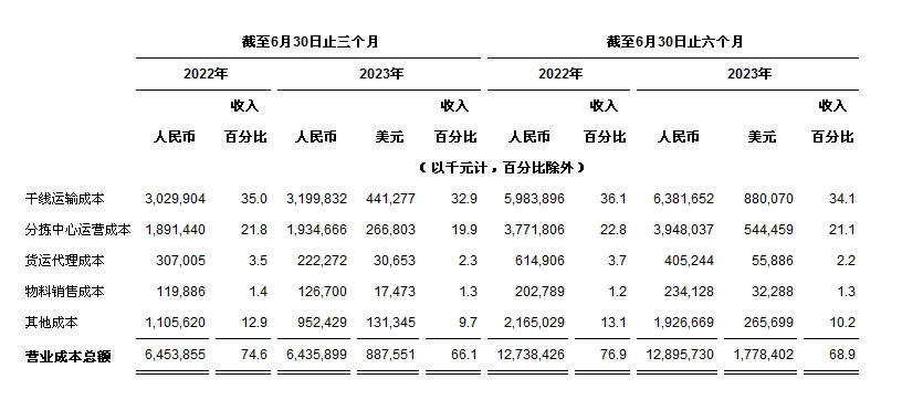 干线运输成本为人民币 3,199.8 百万元(441.3百万美元),较去年同期的人民币 3,029.9百万元增长 5.6%。单位运输成本下降了14.7%或7分,主要得益于规模效益的发挥,干线路由规划的优化及燃油价格的下降。与去年同期相比,自有运营的高运力车辆增加了约50辆,这有助于提高运营效率。