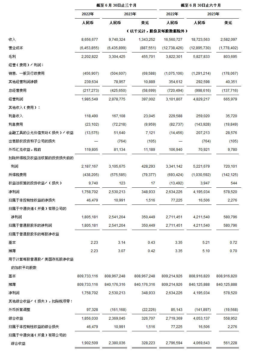 中国行业领先且快速成长的快递公司中通快递(开曼)有限公司(纽交所代码:ZTO 及香港联交所代号:2057)(“中通”或“本公司”)今天公布其截至 2023年 6月 30 日止第二季度的未经审计财务业绩[1]。本公司包裹量同比增长23.8%,市场份额扩大至23.5%。调整后净利润增长 43.9%[2] 至人民币2,531.0 百万元。经营活动产生的现金流为人民币3,761.6 百万元。