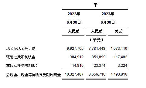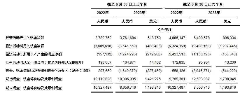 - 经营活动产生的现金流净额为人民币3,761.6 百万元(518.8百万美元),而 2022年同期为人民币3,780.8百万元。