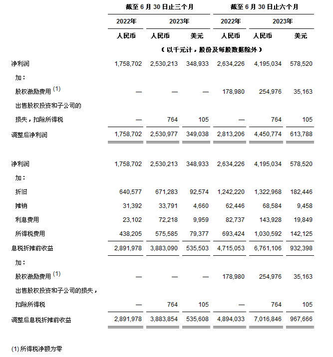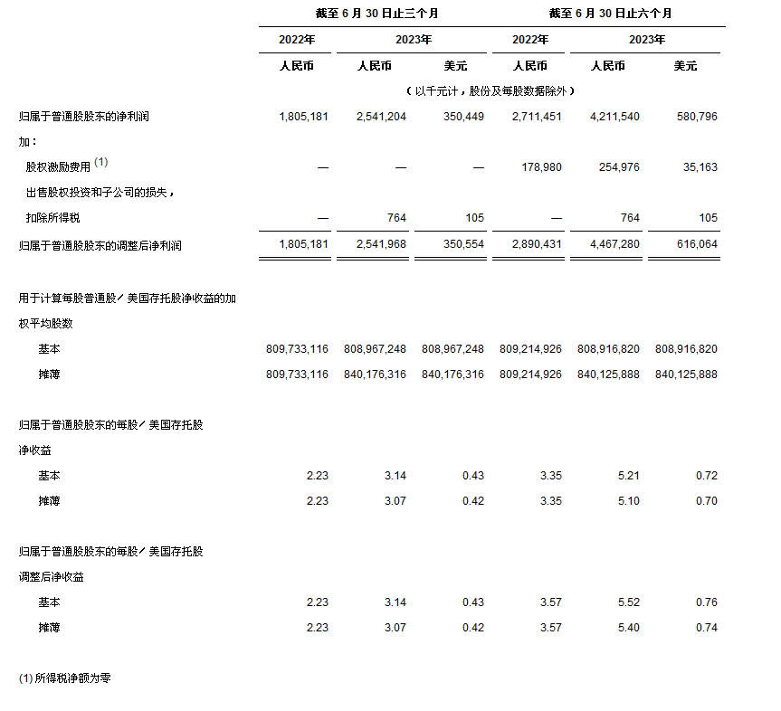 - 归属于普通股股东的调整后基本及摊薄每股美国存托股收益[5]为人民币 3.14元(0.43美元)及人民币 3.07元(0.42美元),较2022年同期的人民币 2.23 元及人民币 2.23 元分别增长 40.8%及37.7%。