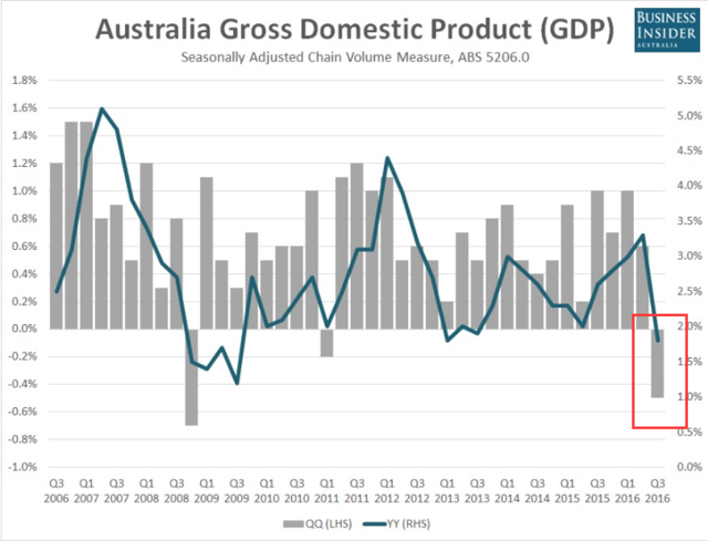 据澳大利亚国家统计局数据,澳大利亚三季度GDP同比1.8%,低于预期2.2%,前值3.3%修正为3.1%;三季度GDP季环比-0.5%,5年来首次为负值,萎缩程度创2008年第四季度以来之最。