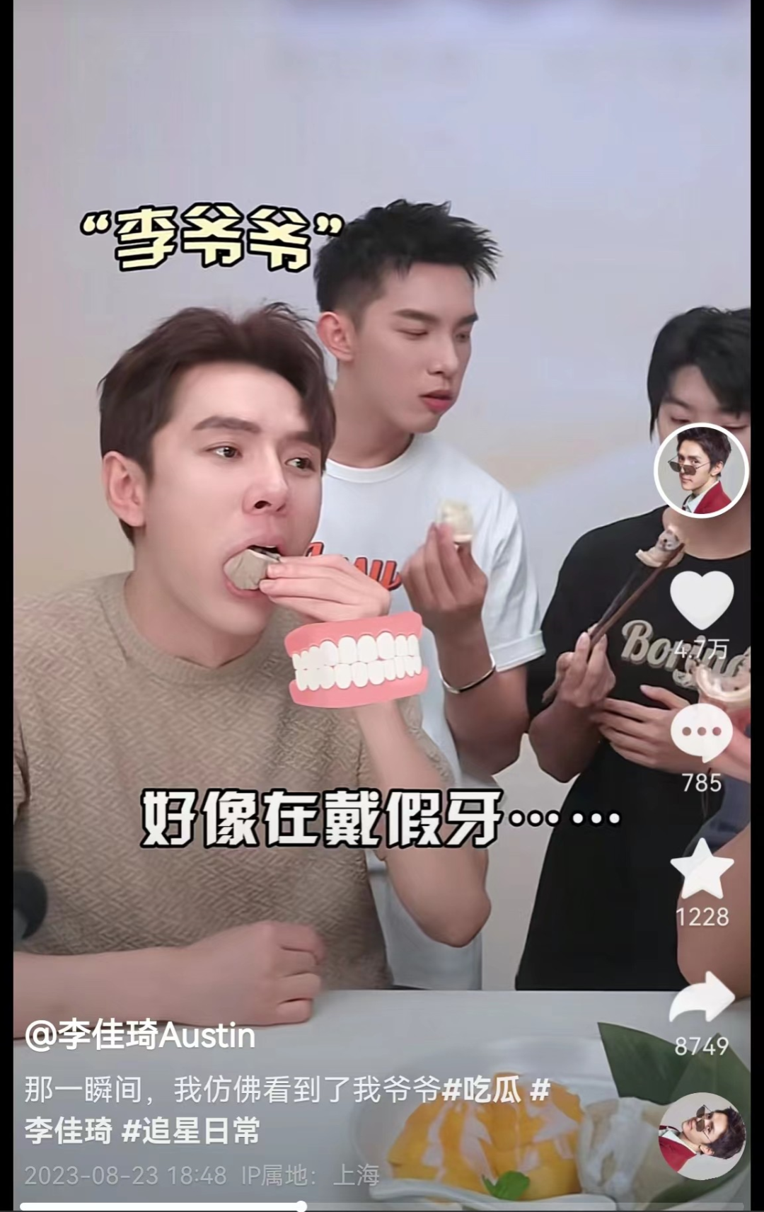 在最近一条李佳琦直播花絮抖音视频里,李佳琦演示吃水果,因为水果的月牙形状颇似假牙,被同事调侃,好像在戴假牙,评论区笑声一遍,还有人问:啥时候直播?
