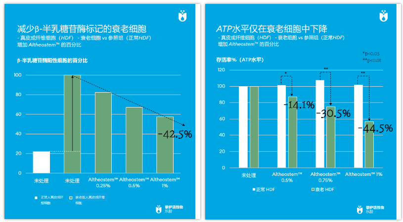 该研究通过各种指标(例如,β-半乳糖苷酶阳性细胞的比例、ATP 水平、磷脂酰丝氨酸暴露水平和半胱氨酸蛋白酶3/7的激活)证明了,Altheostem 对衰老真皮成纤维细胞 (HDF) 具备剂量依赖性凋亡作用,并参与细胞外基质重塑相关基因的表达水平,从而量化了Altheostem 的衰老活性。