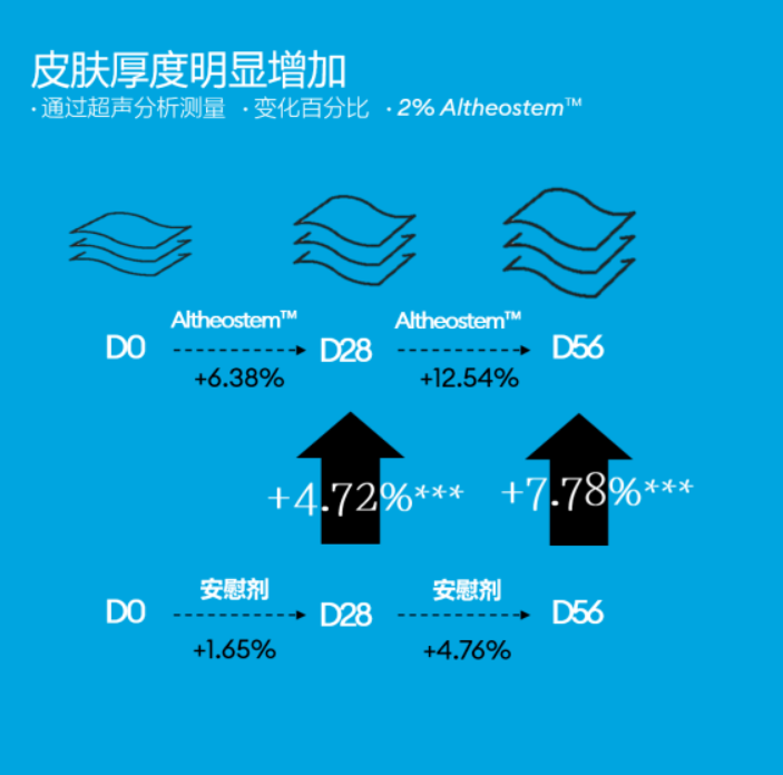 在统计22万张志愿者照片后,计算机估算出所有志愿者的外观年龄变化,证实Altheostem 在临床测试中帮助志愿者减少了3.26岁外观年龄;在使用该成分第28天和56天时,皮肤厚度有明显的改善,眼周皱纹的深度和数量都明显下降。这表明,Altheostem 具备显著的改善衰老迹象功能。