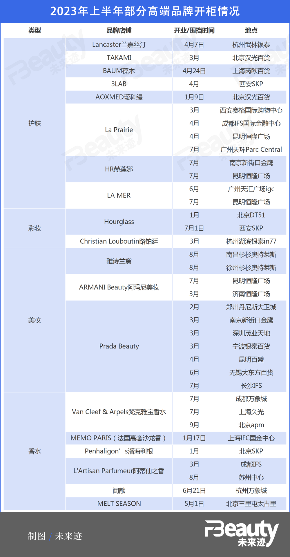 《FBeauty 未来迹》整理发现,上半年赫莲娜、LA MER等高端护肤品牌都有开柜动作,且Prada、阿玛尼、梵克雅宝等高奢品牌也针对美妆线进行开柜。其中,Prada 美妆的开柜速度最快。