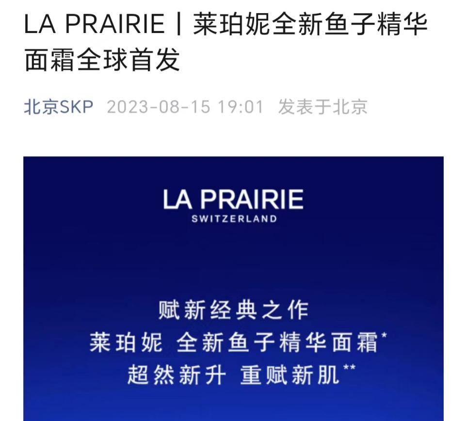 对于品牌的重要新品活动等,商场也会进行联动宣传,如北京SKP官方微信公众号,就在近期发布了「莱珀妮全新鱼子精华面霜」全球首发的相关推广信息,并针对该新品提供专柜限时礼遇。