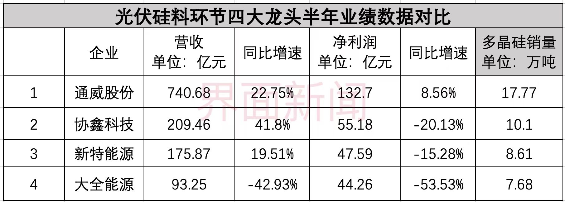 随着协鑫科技业绩的披露,前四大硅料龙头半年财报全部出炉。受到今年硅料价格下行影响,各龙头业绩增速均不及前两年。