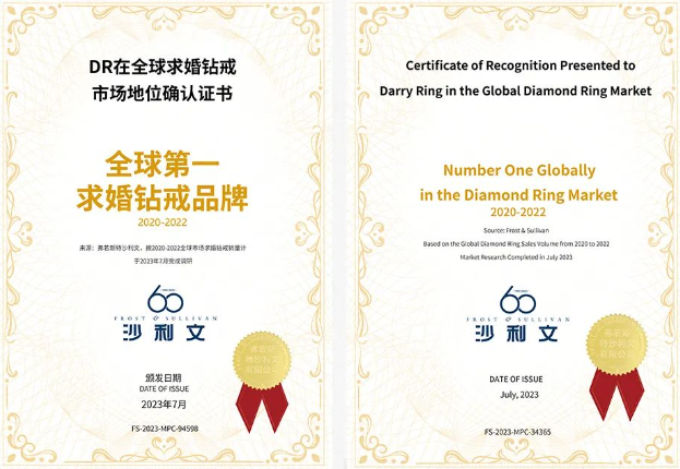 全球知名市场调研机构弗若斯特·沙利文的调研结果显示,2020年至2022年,DR钻戒已经连续三年全球求婚钻戒销量第一、连续三年全球钻戒销量第一。全球数据显示,DR是“全球第一求婚钻戒品牌”和“全球第一钻戒品牌”。