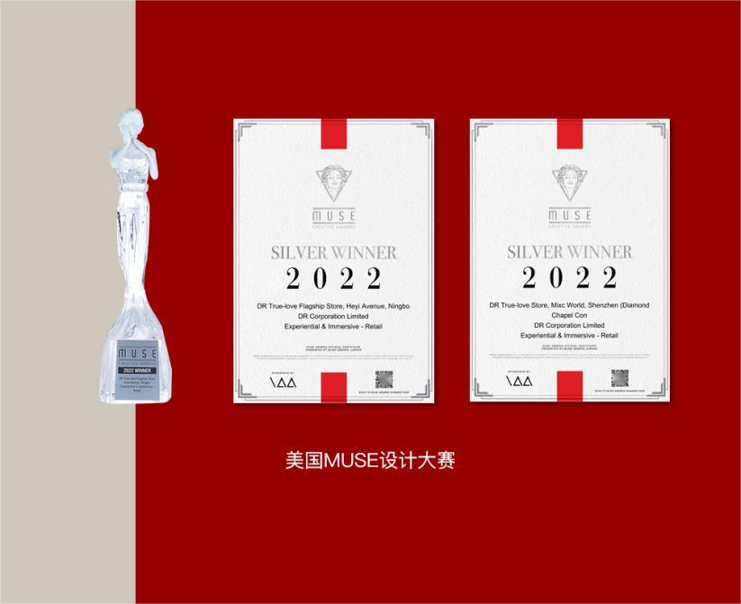 2022年,DR钻戒真爱体验店的空间设计分别以钻石艺术装置和粉色梦幻求婚亭为设计亮点,获得MUSE缪斯创意奖-体验及沉浸设计奖。该奖项由美国博物馆联盟(AAM)与美国国际奖项协会(IAA)主办,是全球创意领域最具影响力的国际奖项之一。