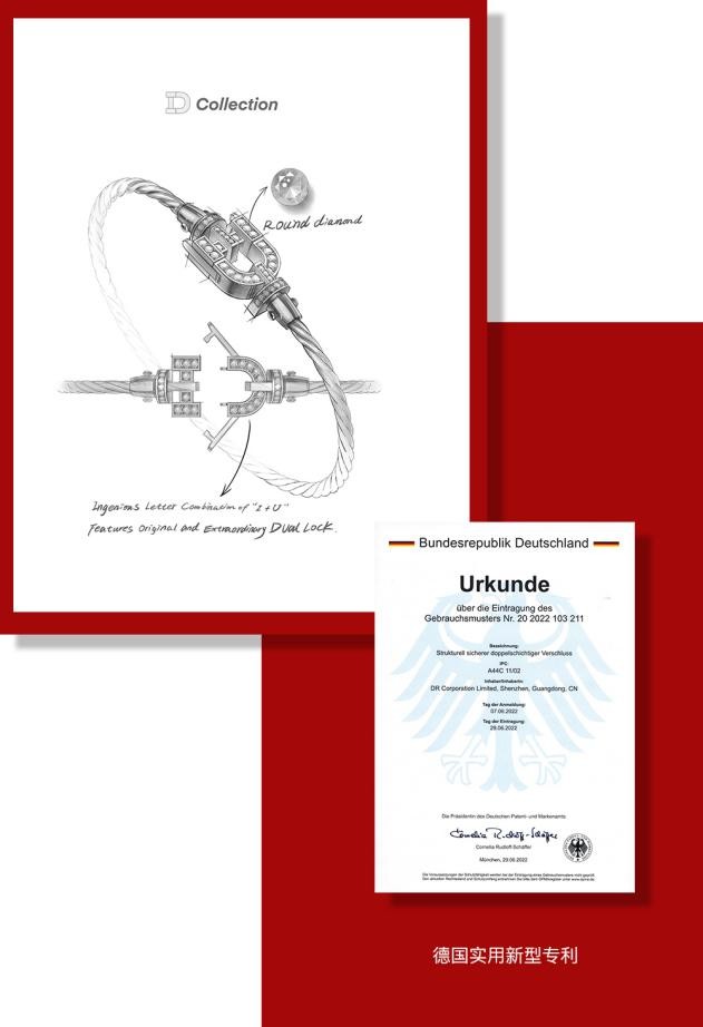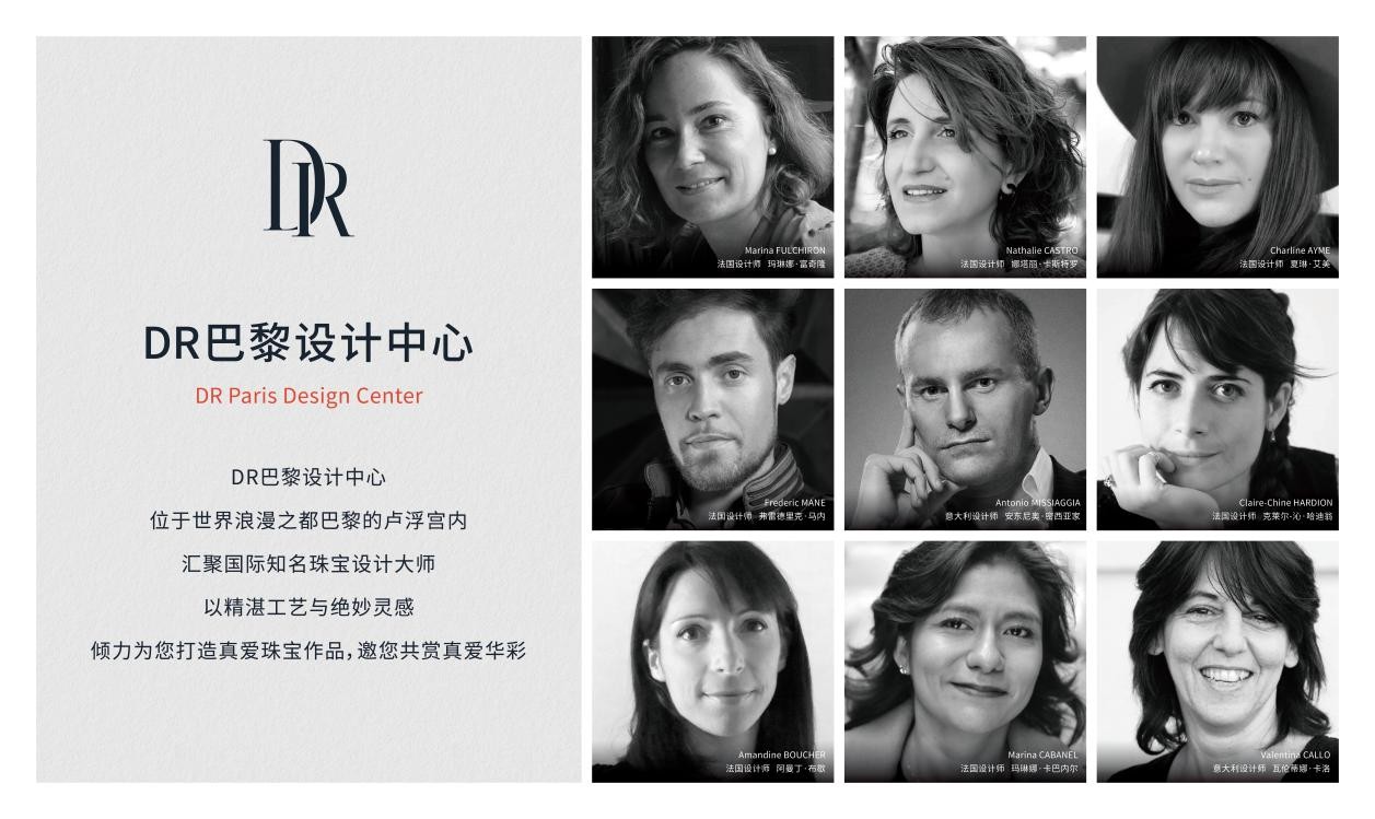 DR钻戒在法国卢浮宫内设有DR巴黎设计中心,汇聚了了一批国内外珠宝设计大师,其中多位毕业于世界知名珠宝设计院校,曾与卡地亚、宝格丽等顶尖珠宝品牌合作。截至2023年7月,DR钻戒就获得了150多款专利,在珠宝行业中处于国际领先水平。