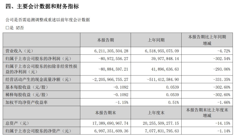 根据半年报,顺鑫农业上半年实现营业收入62.11亿元,和上年同期相比下降4.72%;实现归属于上市公司股东的净利润为-8097.26万元,和上年同期的3997.78万元相比,由盈利转为亏损,大降302.54%,其余各项经营业绩指标均有不同程度的下滑。