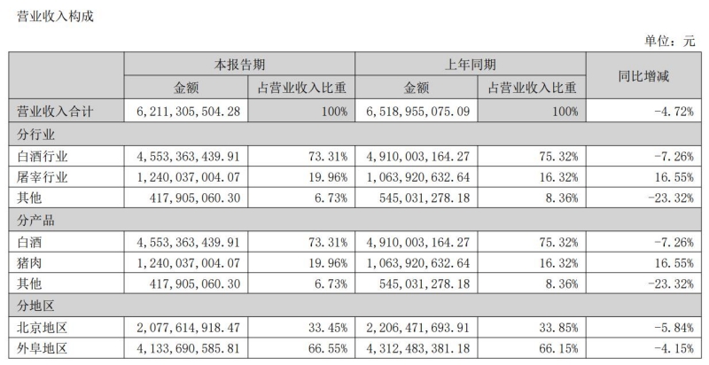 2023年上半年,全国规模以上白酒企业白酒产量同比下降14.8%。在宏观经济大环境下,顺鑫农业的白酒销售额相较去年同期有所下降,公司白酒产业实现营业收入45.53亿元,同比减少7.26%。猪肉产业板块实现营业收入13.46亿元,其中屠宰业务销售收入12.40亿元,种畜养殖业销售收入1.06亿元;