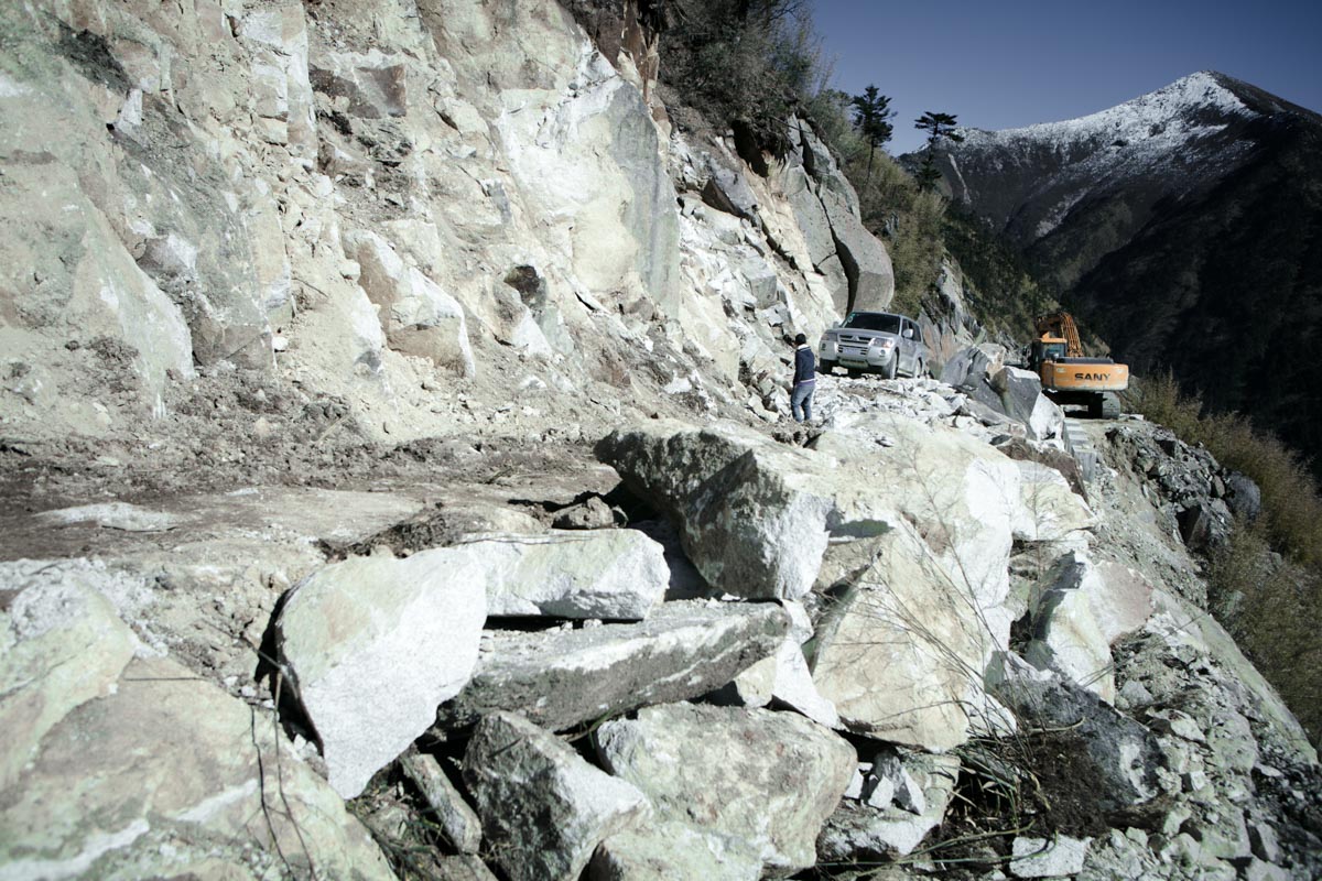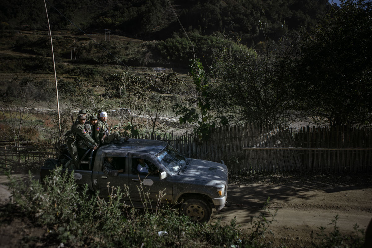 正式拍摄的第一天,我们从云南省怒江州福贡县出发,前往20公里外的克钦邦。沿途是一个即将开发成旅游景区的山谷:雪山森林和瀑布,景色壮阔,人迹罕至。到达垭口处的中缅界碑处时,我们看到前来巡视的武警们开心地拍照留念。这种氛围给我们带来某种旅行的轻松感。随后,HPA克钦项目经理田漾辉指了指垭口的另外一边说:“那就是缅甸克钦了”。