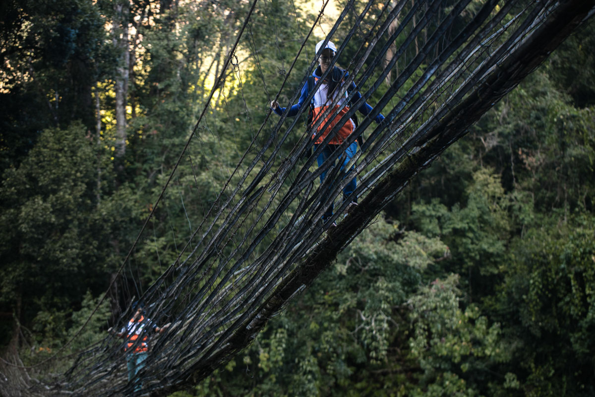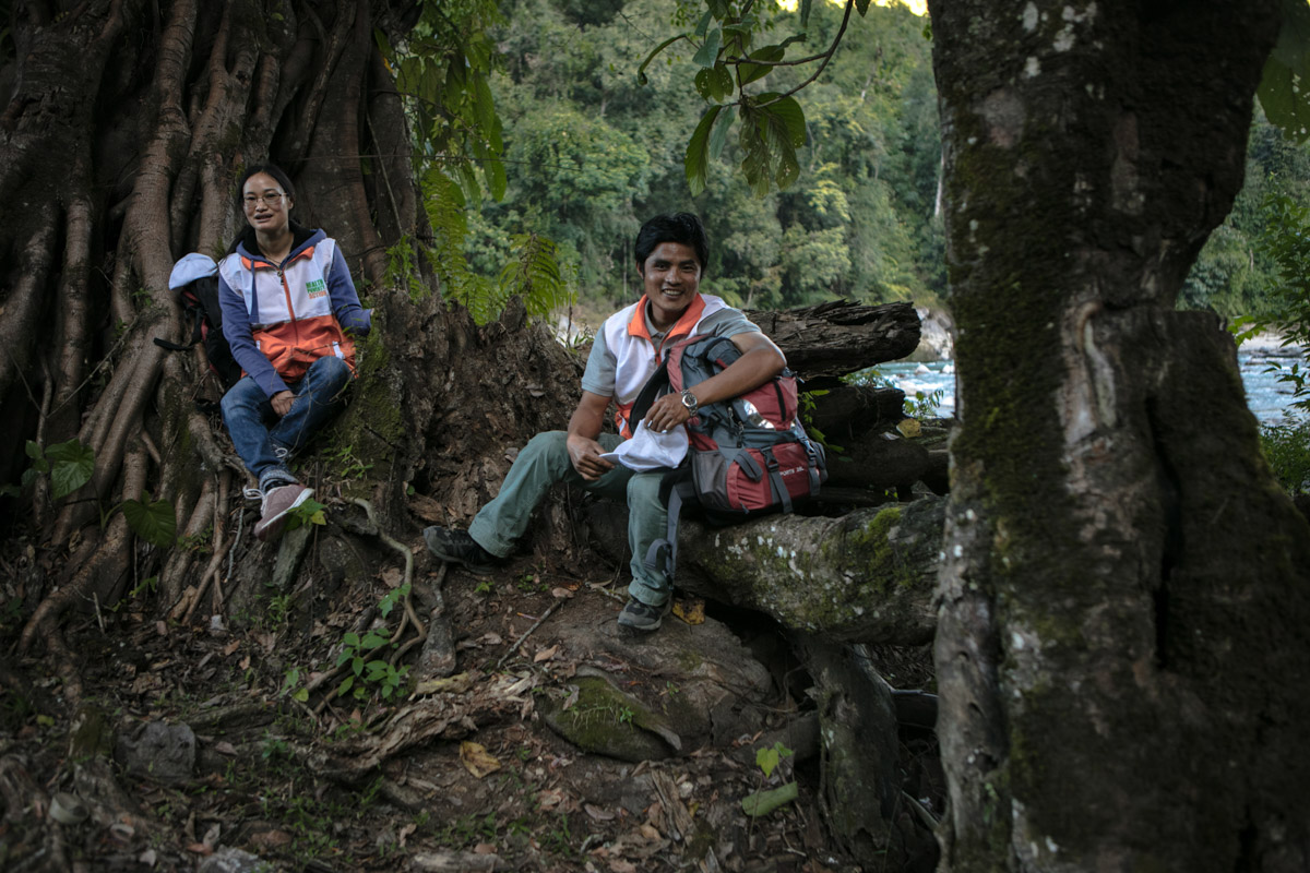 然而直到两个小时后,我们还在下山——全程几乎都是四十五左右的陡坡,若有若无的小路沿着悬崖边蜿蜒。中午十二点左右出发,我们抵达江边时已经是下午四点。当我们与志愿者会合后折返时,同行的HPA东亚区总干事——50岁的张军——脸色忽然变得煞白。他一屁股坐在地上说:“心脏不舒服”。这时,密林间透下来的天光迅速暗了下来,而更难走的路还在后边:一段陡峭的悬崖和一座悬崖上的独木桥。