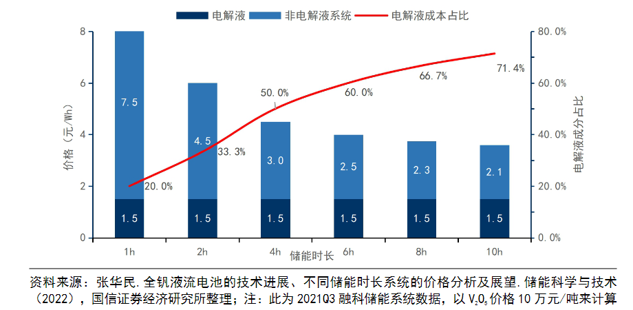从经济性上看,全钒液流电池储能的初始投资成本在2.5元-7.5元/Wh,时长越大,单瓦时的投建成本越低,8小时以上可以降到2元/Wh左右,接近锂电储能。而且,全钒液流电池的寿命长达20年,是锂电池的2倍,这进一步摊低了初始投资的单位成本,成本更优于锂电储能系统。即便是20年寿命到期,钒液流电池电解液的残值和循环利用价值也高达30%以上,全生命周期成本更低。未来,随着更多全钒液流电池储能项目的上马,很容易在市场层面引发共鸣。